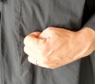 Take your right hand and cover your left fist as in the picture above. This is called, “Upholding the precious treasure.” When you are holding the Shashu kata, your eyes should be half open at a forty five degree angle and you should be gently breathing only from your nostrils. As you inhale, sink into the felt warmth and sensuality of your lower abdomen. Sense your body’s vital center point of gravity that is located about two inches below your navel.